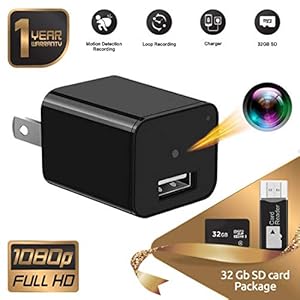 ★ Tusionwin USB Charger Spy Camera – This compact spy security camera is a USB charger that charges portable devices and records 1080p Full HD video with wide 90° angles.